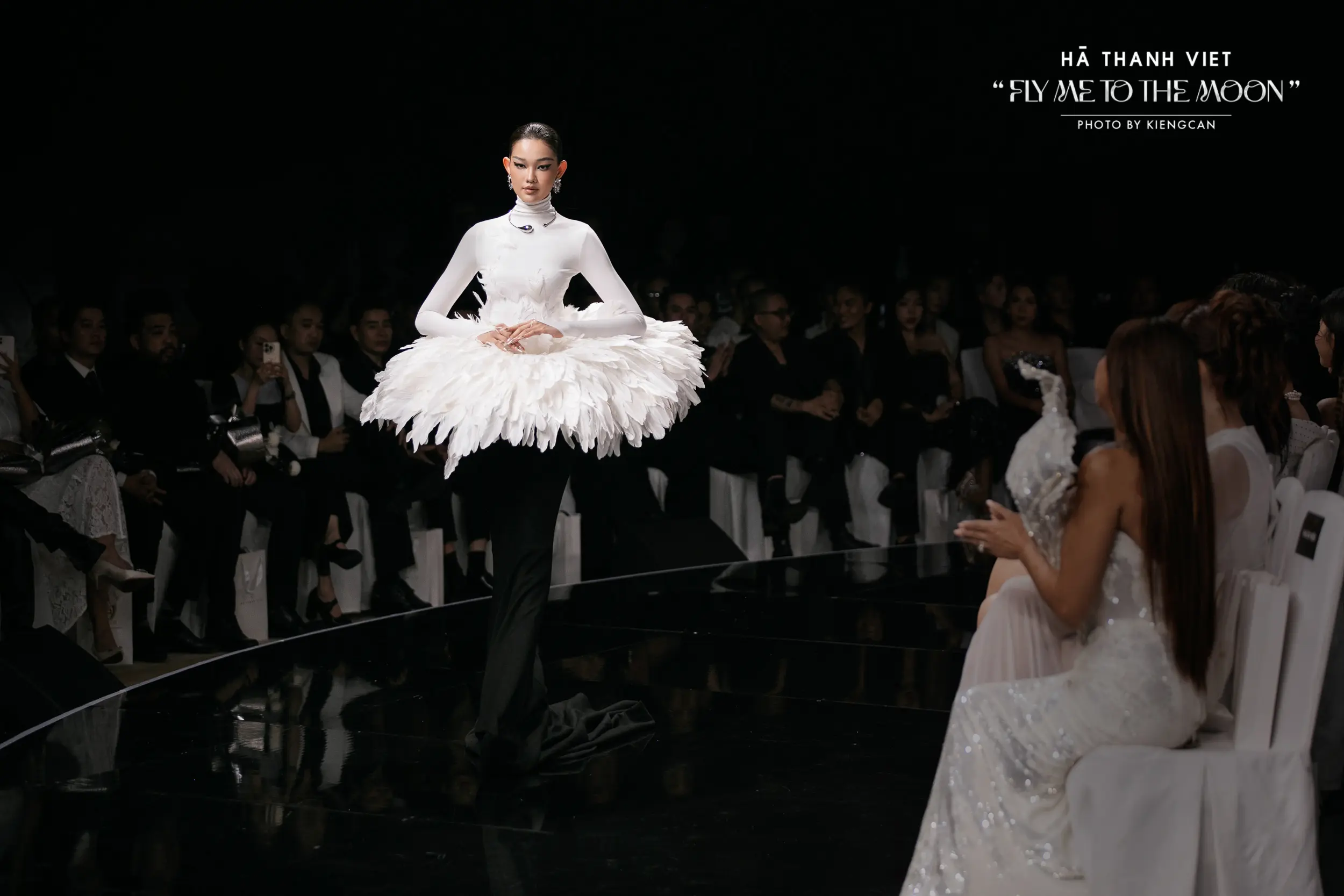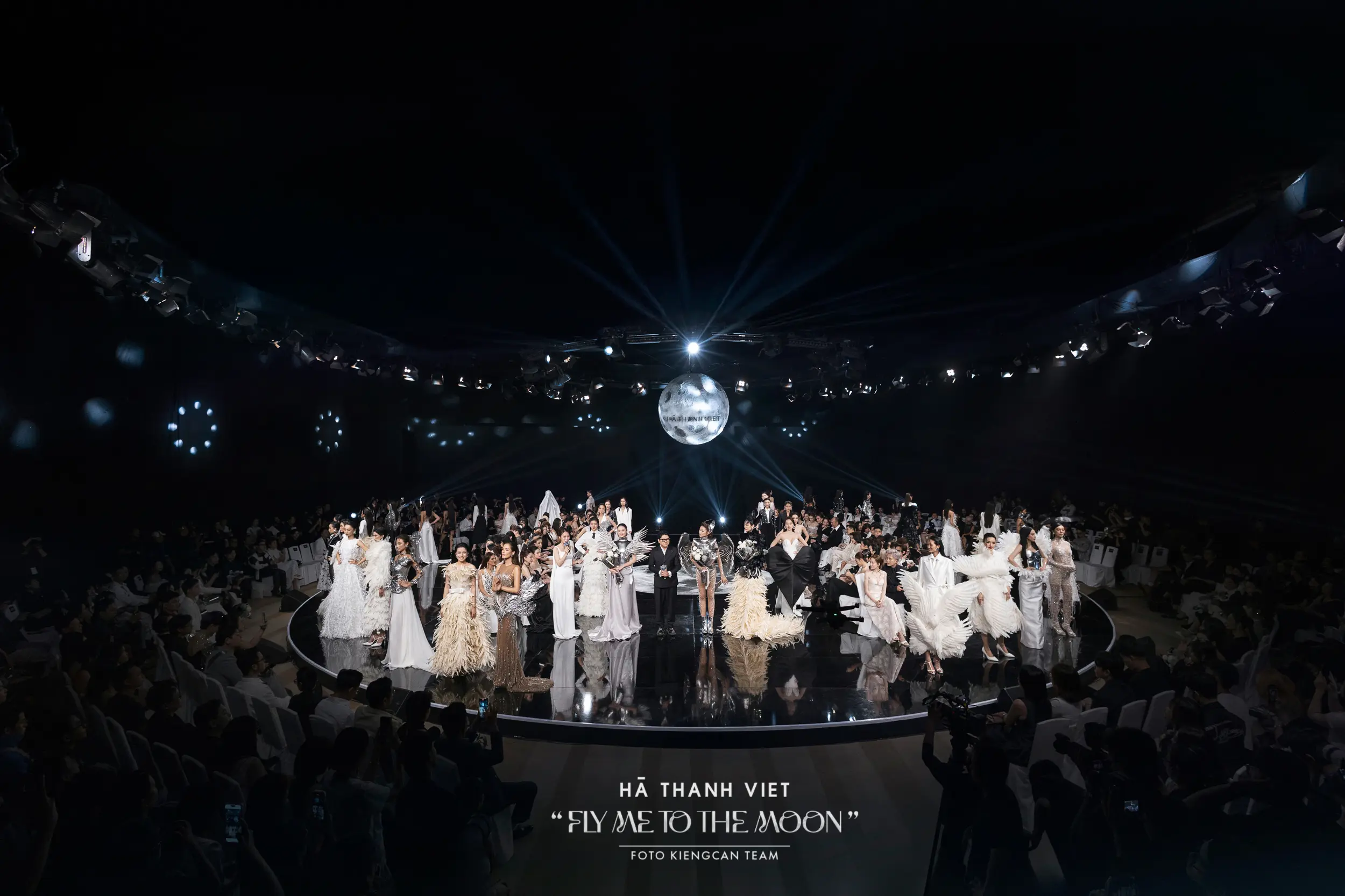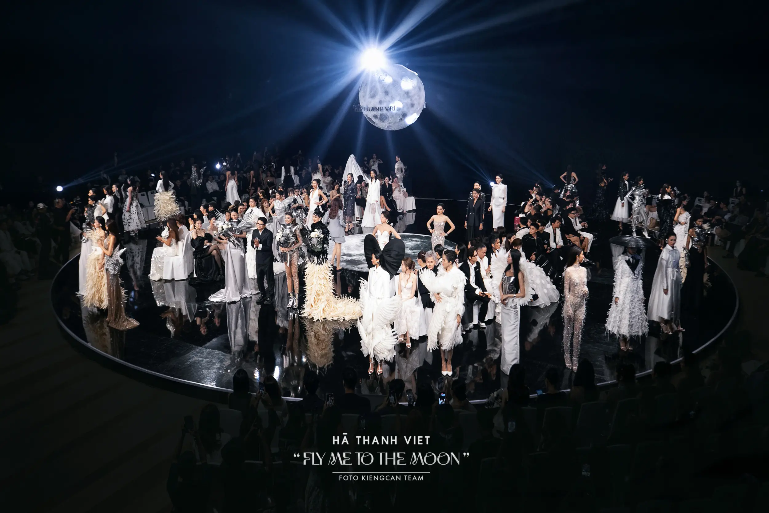 In the modern space of Hall A – White Palace Pham Van Dong, “Fly me to the Moon” is dressed in a magical, surreal beauty with a floating moon model and a unique circular runway. This impressive space, combined with creative designs and the melodious violin sound of the song Fly Me to the Moon, created an inspiring fashion show, affirming the vision and desire to conquer fashion’s universe of designer Ha Thanh Viet in the future.