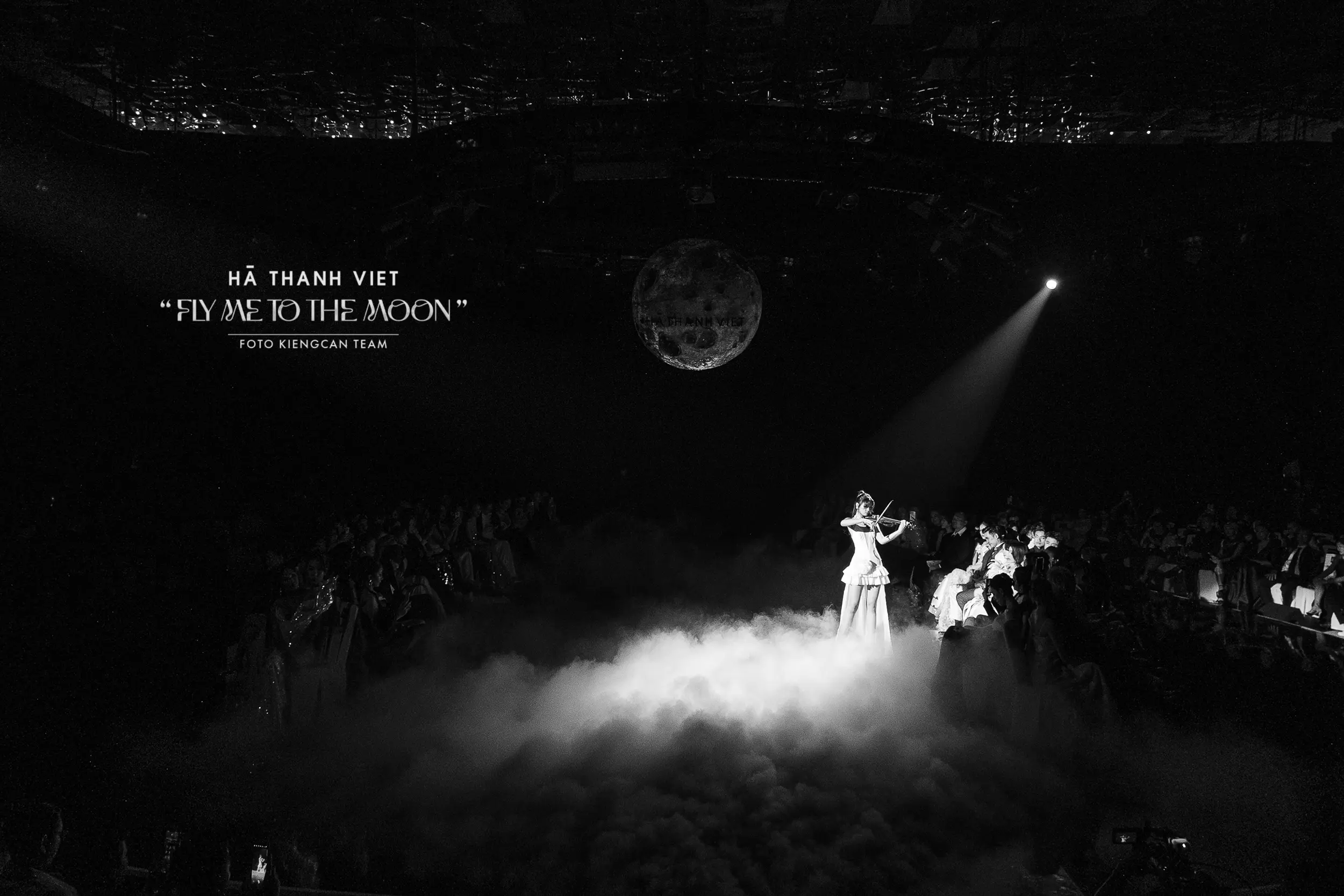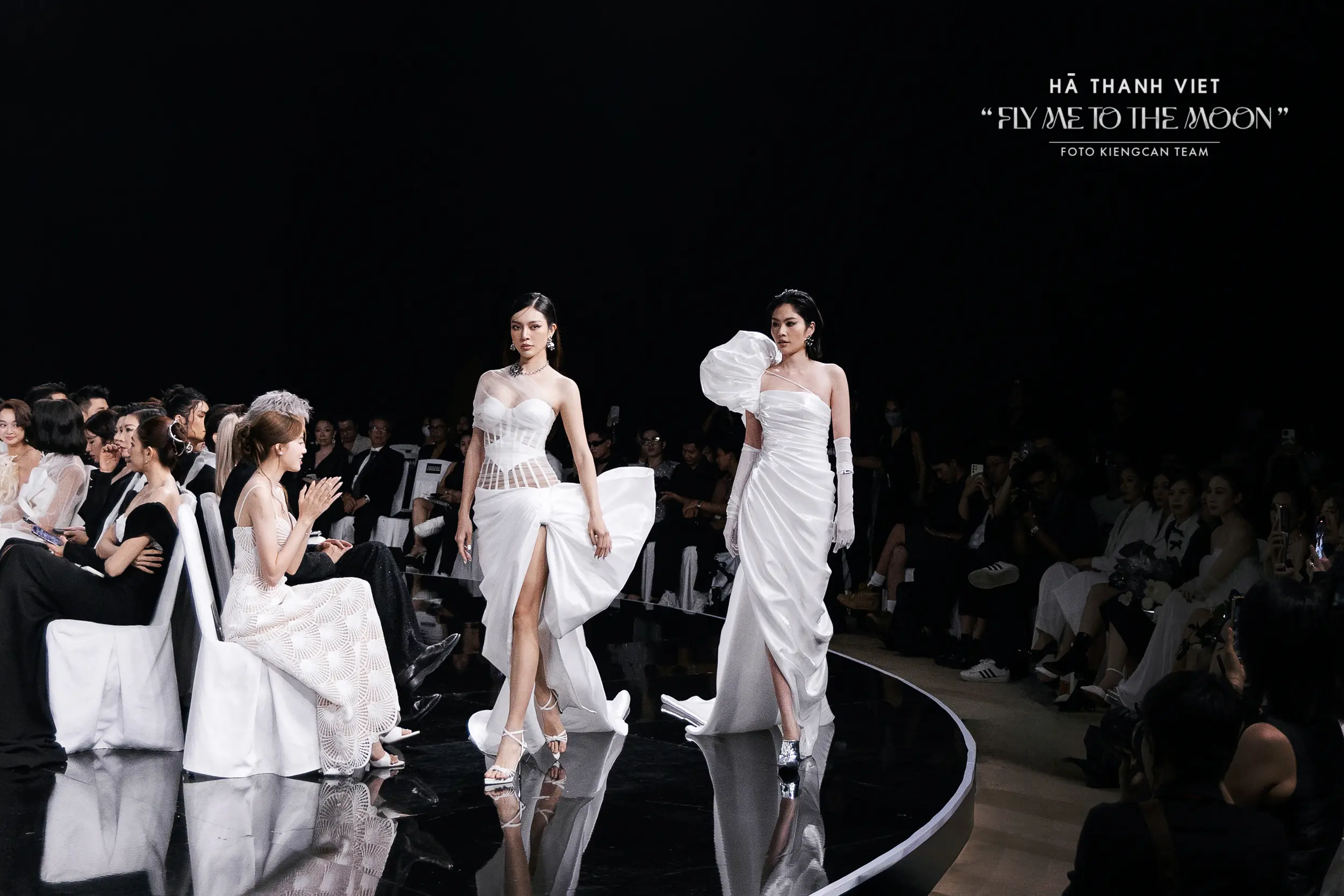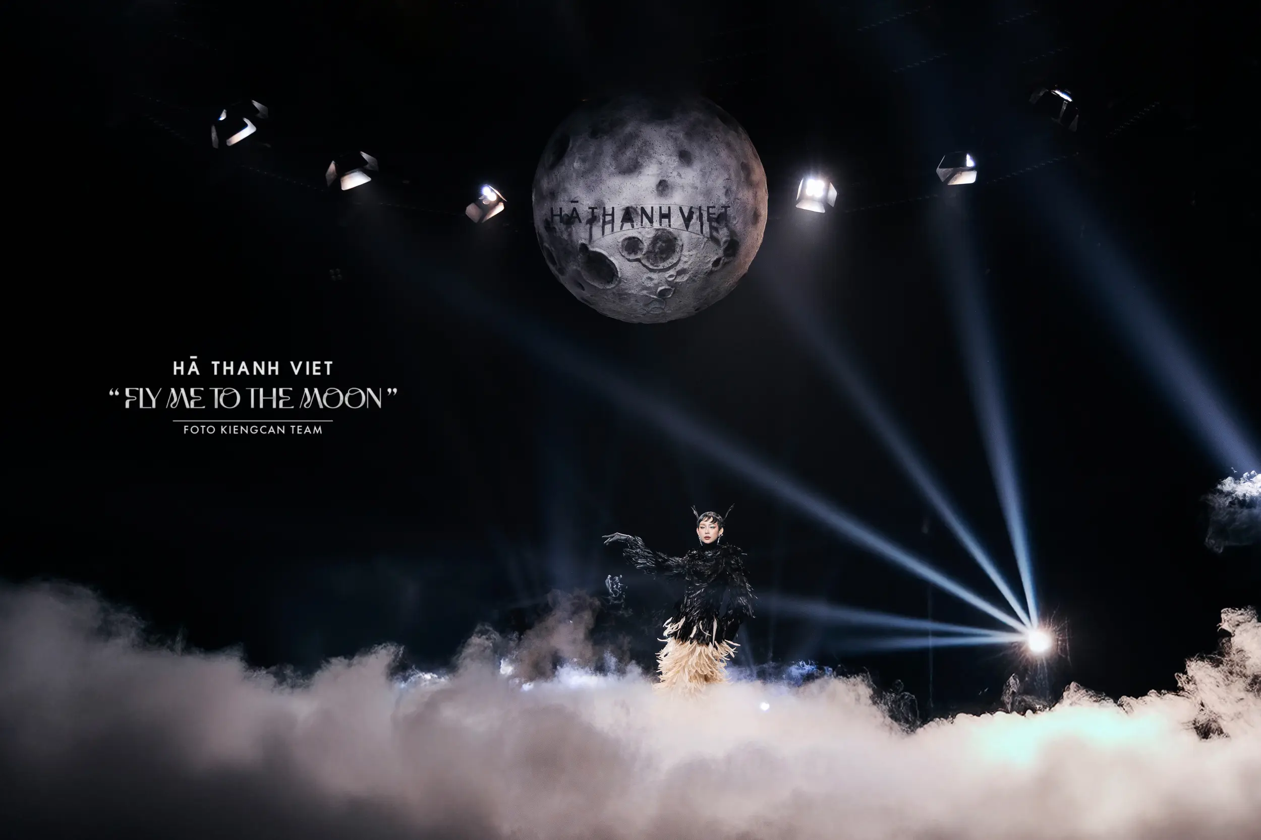 In the modern space of Hall A – White Palace Pham Van Dong, “Fly me to the Moon” is dressed in a magical, surreal beauty with a floating moon model and a unique circular runway. This impressive space, combined with creative designs and the melodious violin sound of the song Fly Me to the Moon, created an inspiring fashion show, affirming the vision and desire to conquer fashion’s universe of designer Ha Thanh Viet in the future.
