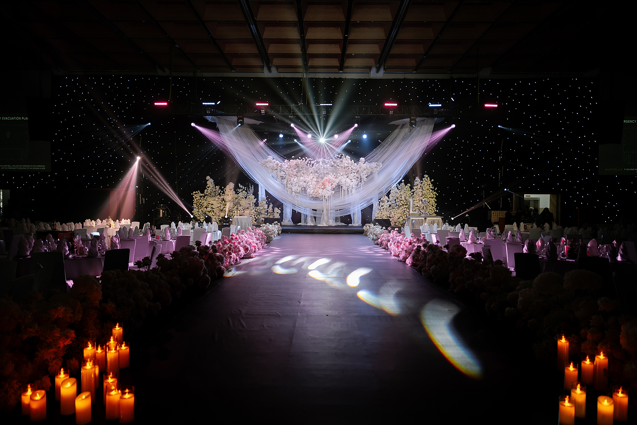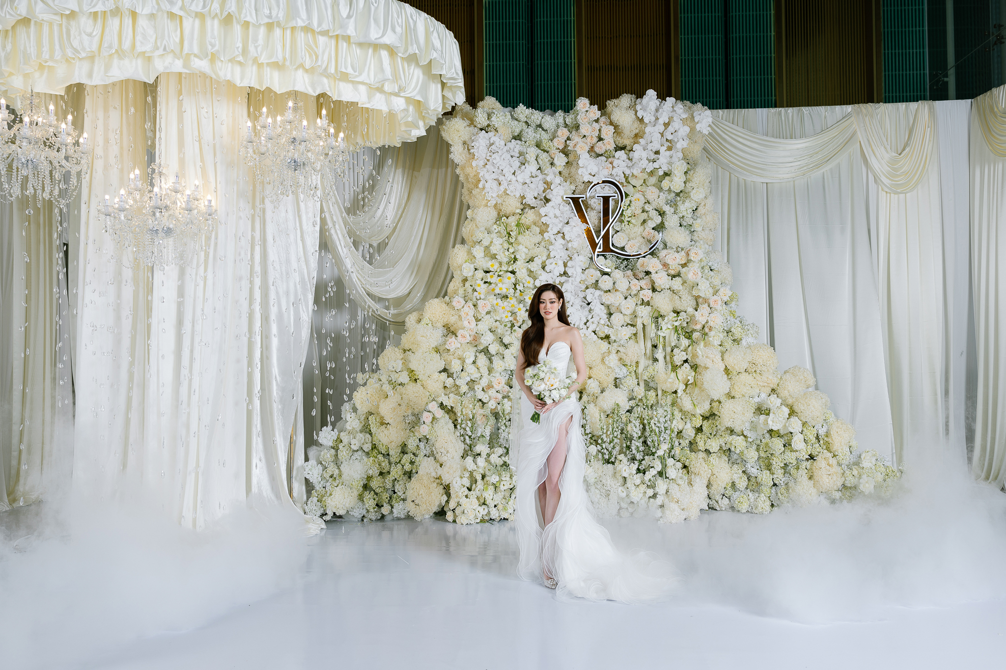With 50,000 imported fresh flower branches, soft curving satin silk strips and shimmering light from luxurious crystal ceiling lamps, the Felix – White Palace Vo Van Kiet lobby space has transformed into a gorgeous flower paradise. Gorgeous on the big day of Miss Khanh Van & Photographer Nguyen Long. From the 4.5m high welcome gate, the waterfall of white flowers at the check-in area to the main stage like a romantic flower cloud, every detail of the party night is imbued with the beauty’s artistry and personal colors. Khanh Van & Photographer Nguyen Long.