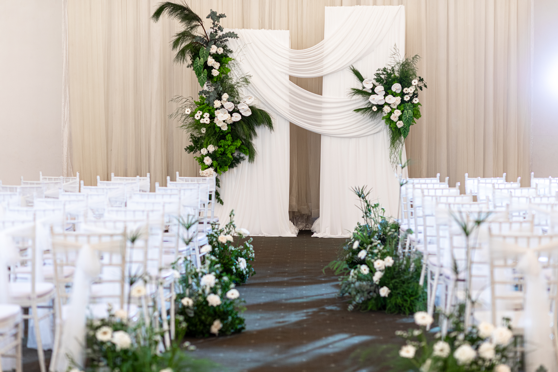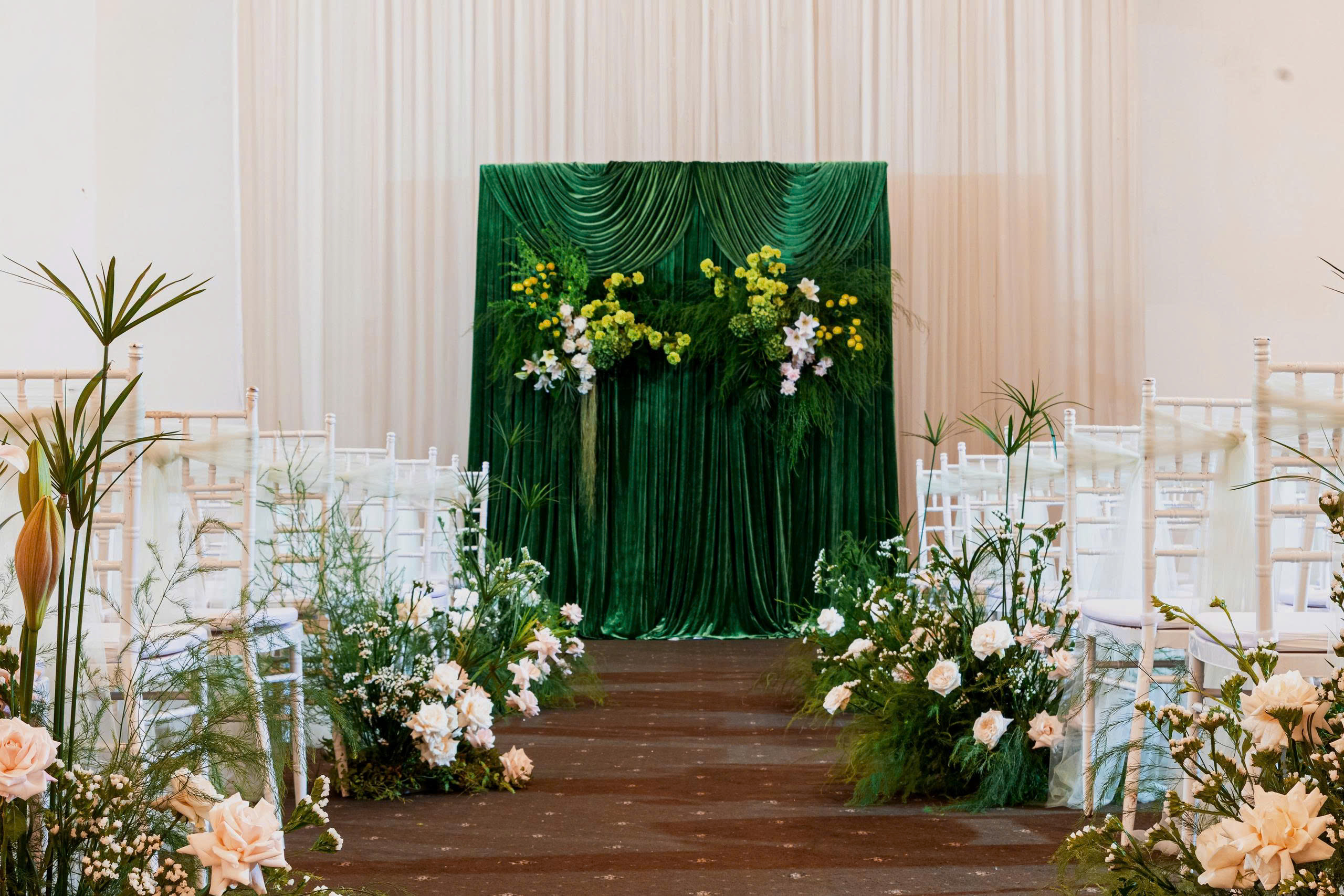 - Sân khấu và lối đi được trang trí hoa tươi trang nhã
