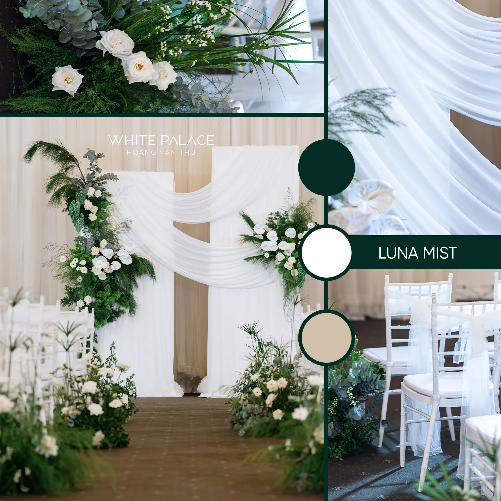 Không gian tinh khôi, thanh khiết như làn sương khẽ bay dưới ánh trăng dịu dàng, điểm xuyết voan mỏng và hoa trắng nhẹ nhàng, hoàn hảo cho cặp đôi yêu sự giản dị, thuần khiết và muốn buổi lễ diễn ra êm đềm, sâu lắng.