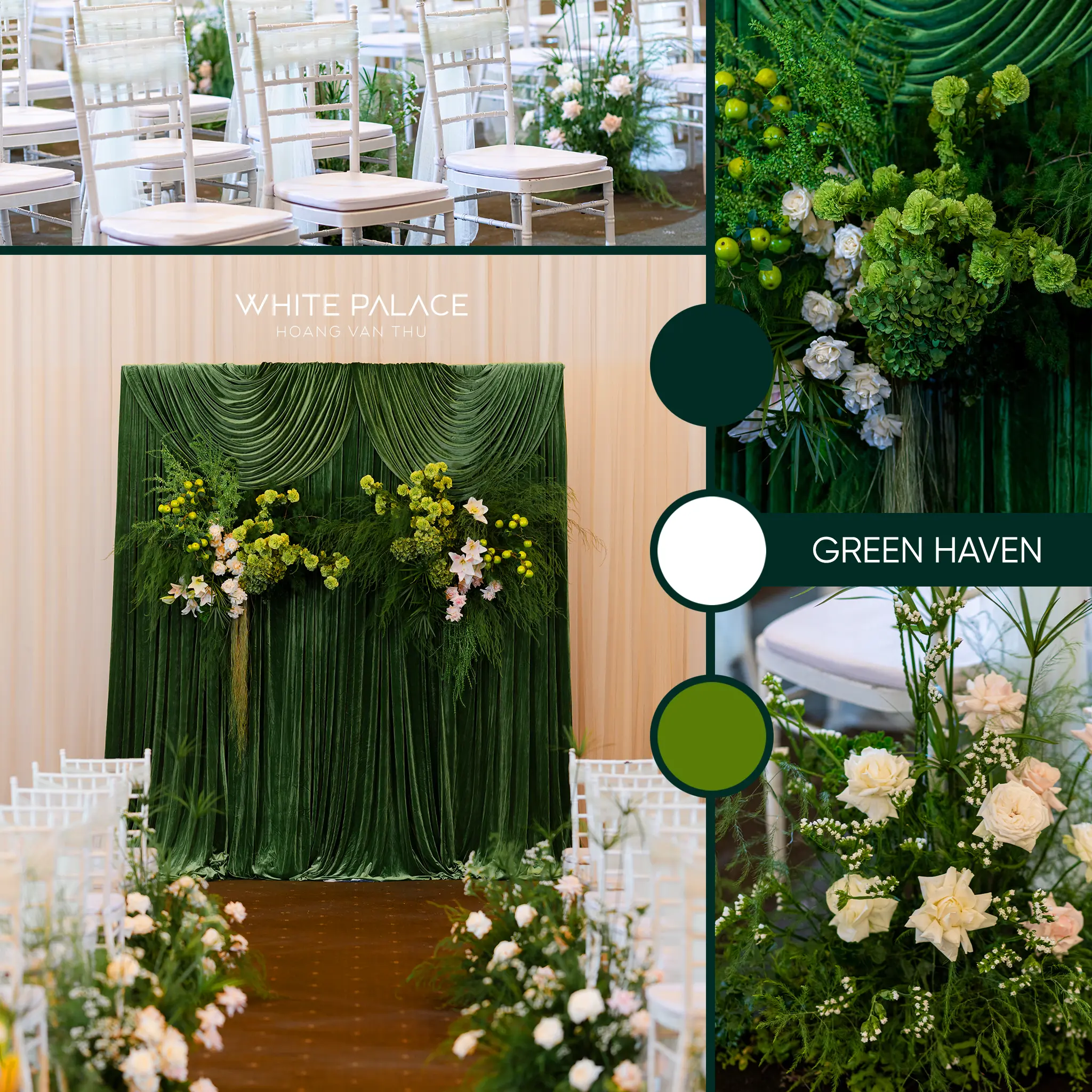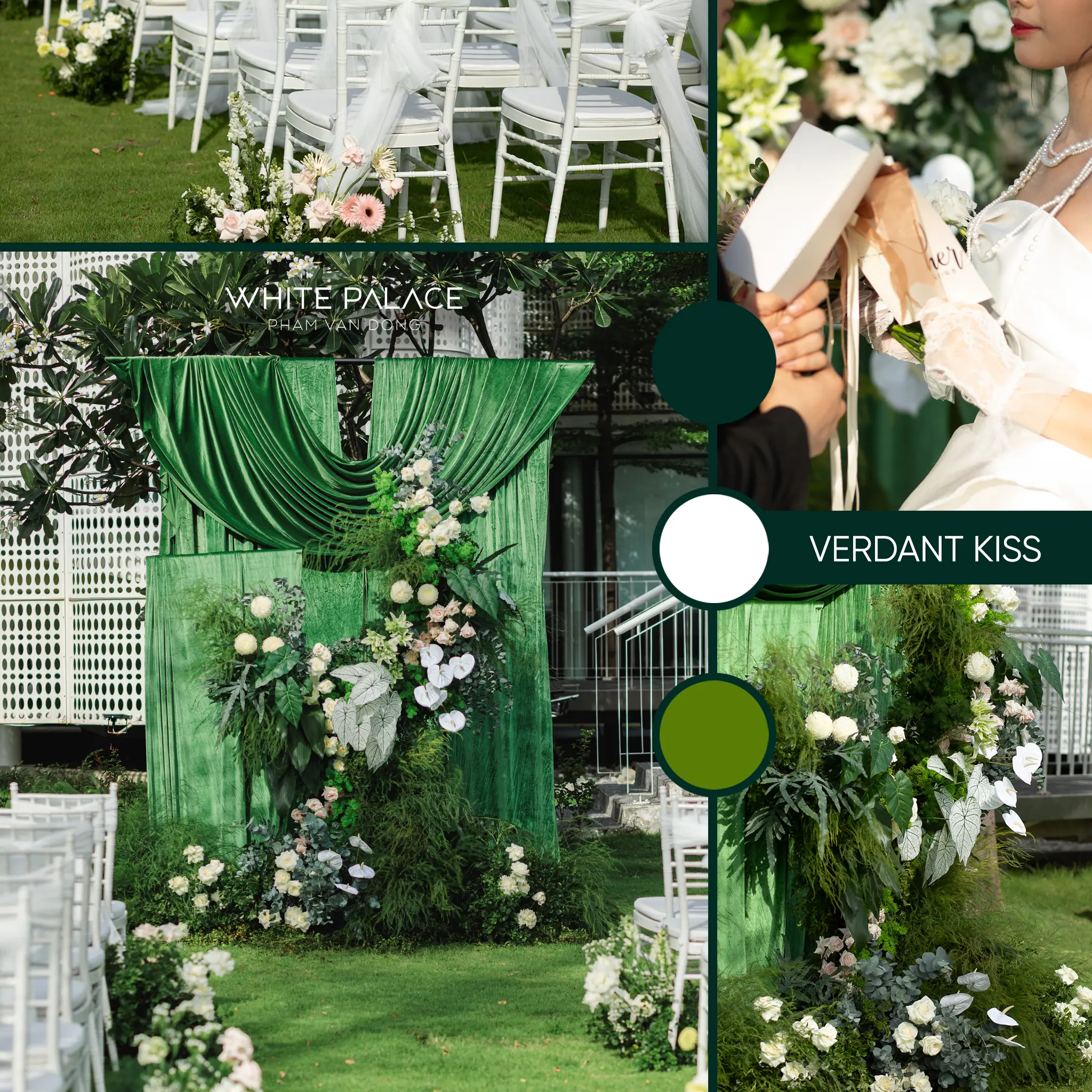 Không gian thanh thoát, phủ hoa trắng và lá xanh tươi mát. Mang đến cảm giác tinh tế, thuần khiết – lý tưởng cho những tâm hồn nhẹ nhàng và trân trọng vẻ đẹp giản đơn trong phút giây hứa nguyện.