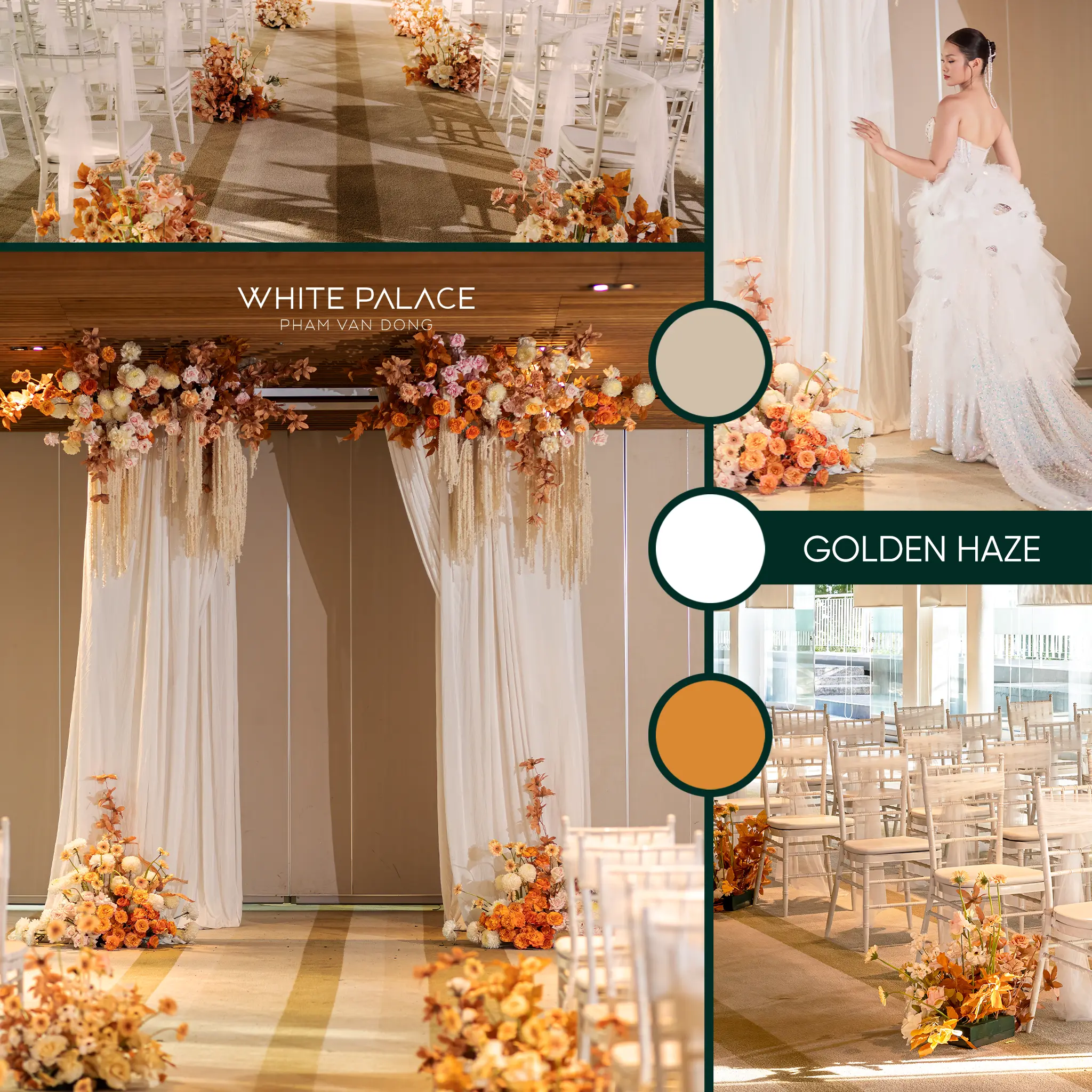Sắc vàng, cam đất và nude ấm áp như ánh hoàng hôn. Hoa trải dài từ lối đi lên tận trần, tạo nên khung cảnh vừa sang trọng, vừa ấm cúng – dành cho những cặp đôi trưởng thành, sâu sắc và yêu sự lãng mạn.