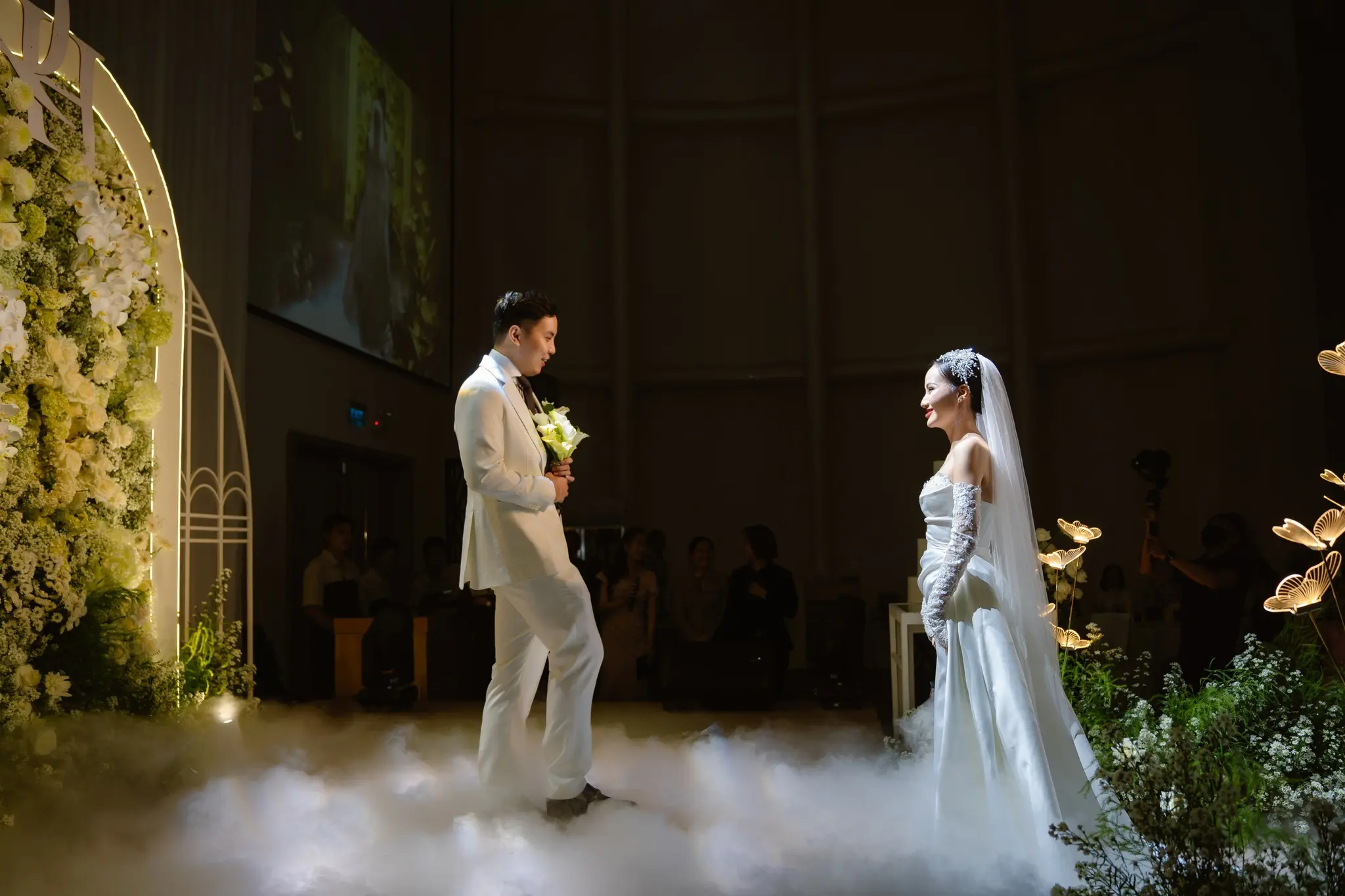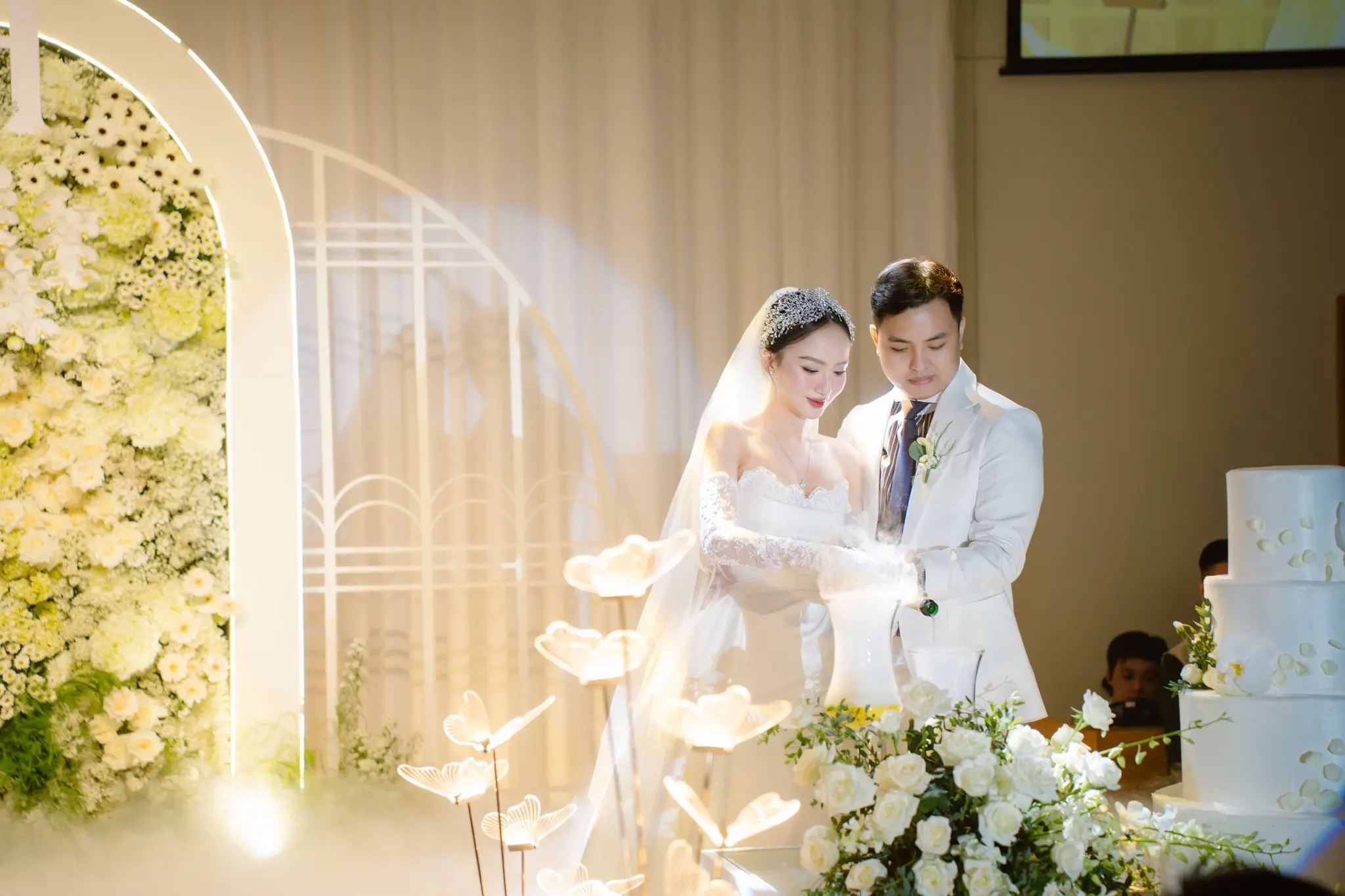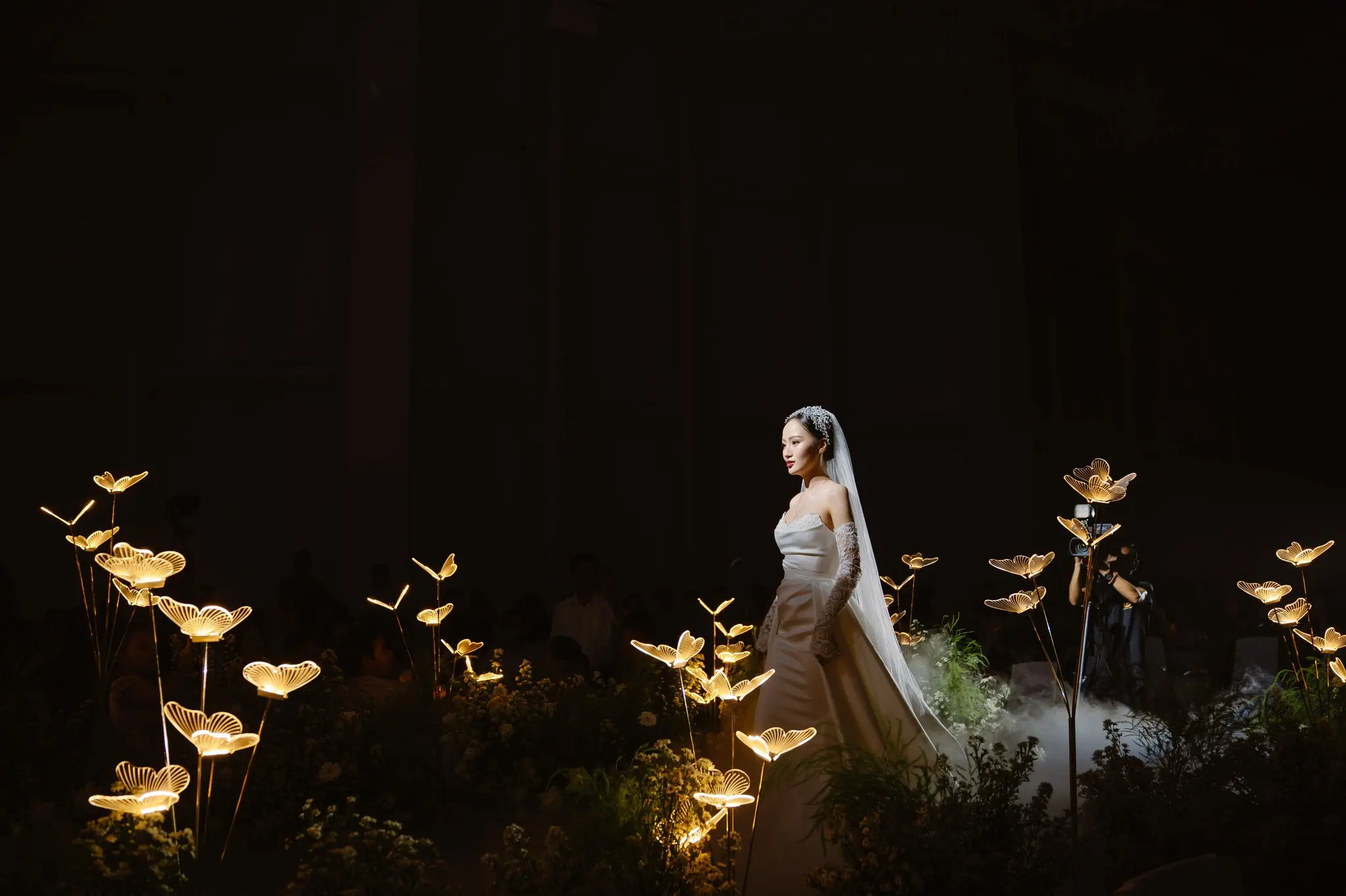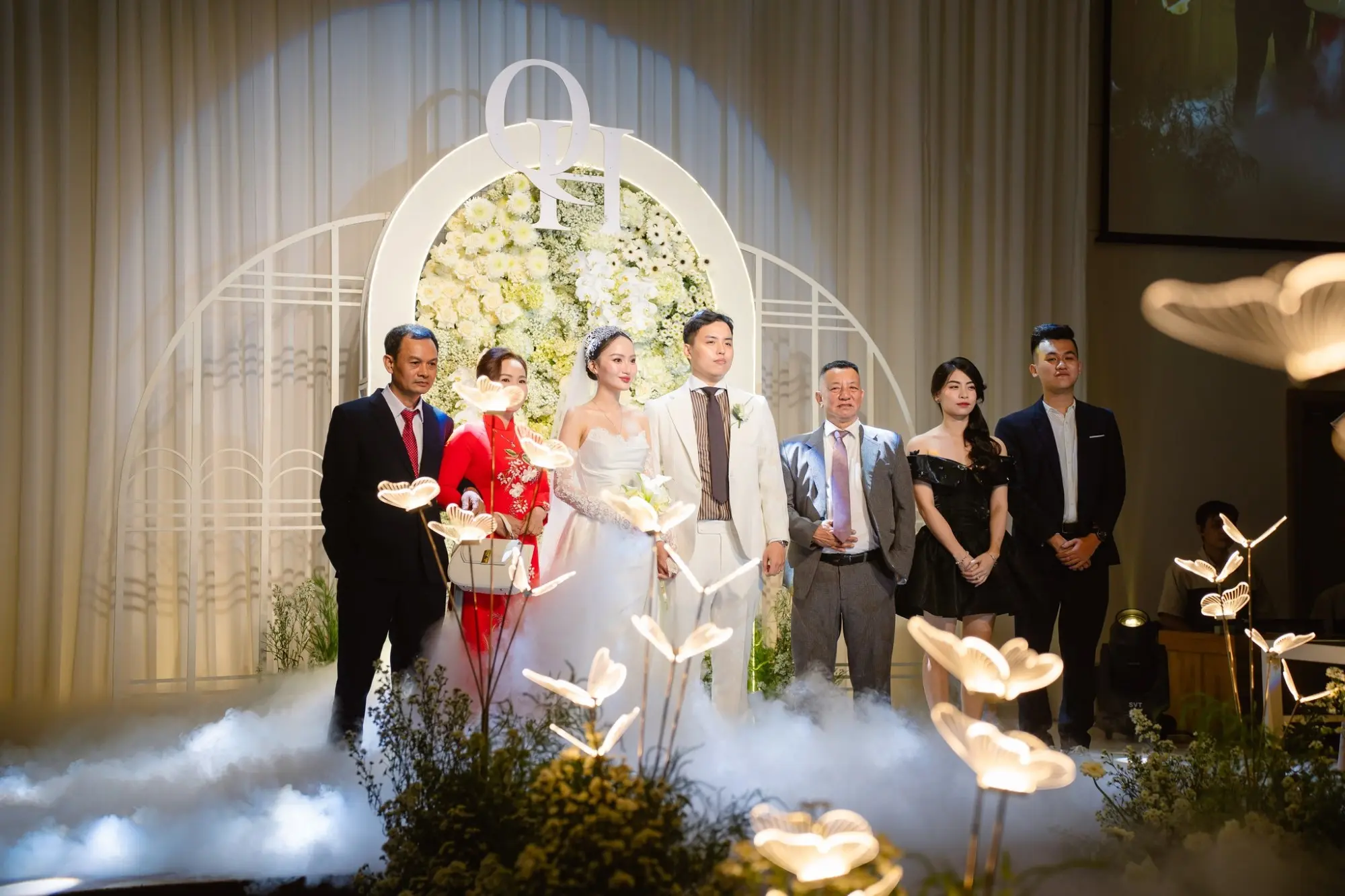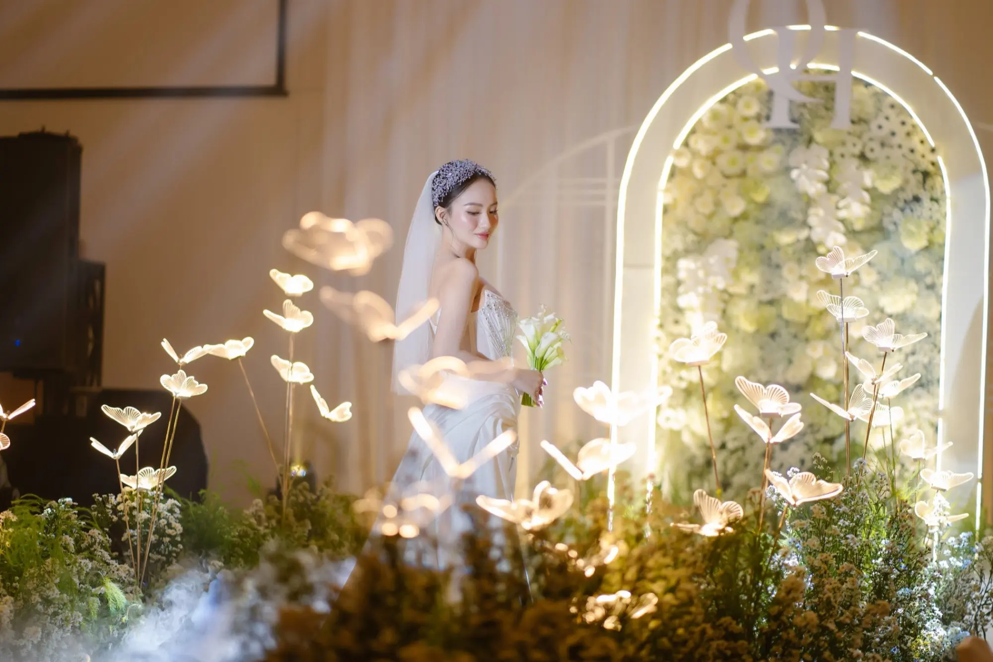 Với mong muốn khắc họa lại cảm xúc tuyệt vời này trong ngày trọng đại nhất, cặp đôi Huyền và Quang đã dựng nên một khu rừng bươm bướm tại White Palace Võ Văn Kiệt, tạo nên bầu không khí kỳ ảo và ngập tràn mơ mộng, dẫn dắt khách mời bước vào câu chuyện tình yêu của riêng đôi uyên ương.