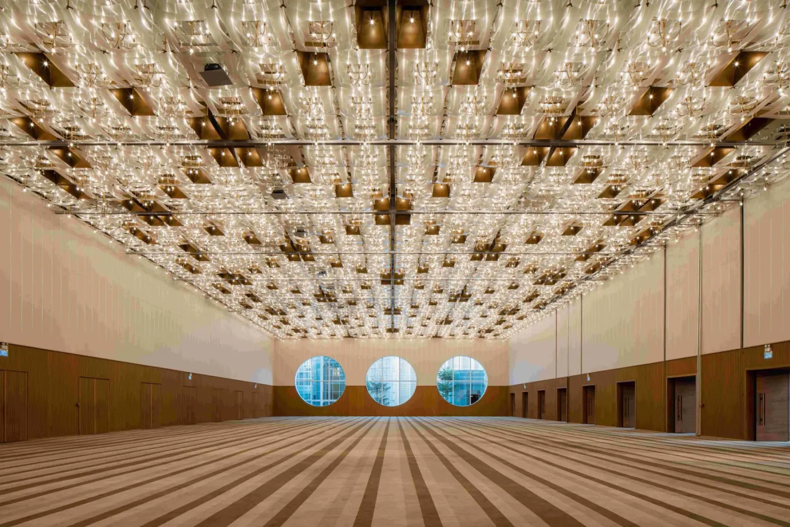 Thiết kế gỗ uốn lượn kết hợp mặt trần tráng gương lấp lánh ánh bạc mở ra khoảng không gian sâu dẫn đến hai đại sảnh lớn nhất của trung tâm sự kiện White Palace là Hall A và Hall B.