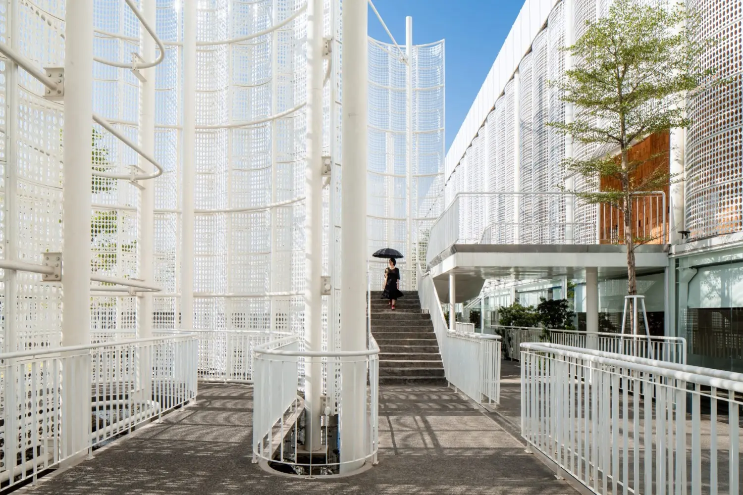 Kết cấu thép với hoa văn hiện đại được lồng ghép một cách lớp lang, nhịp nhàng cùng mảng xanh thiên nhiên